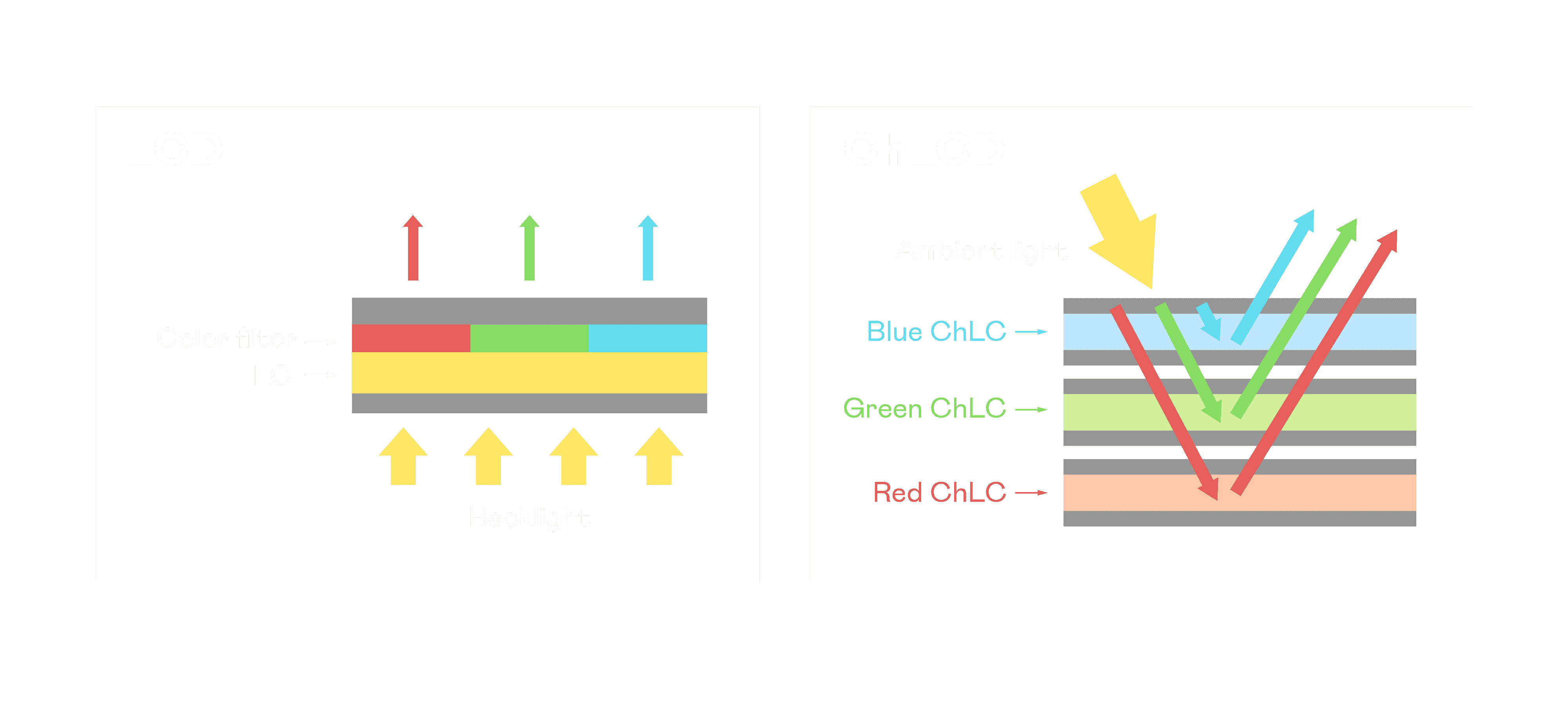 ChLCD 胆固醇液晶就如同纸张一样,,,,透过反射环境光来显示影像,,因此长时间观看不易造成人眼视觉疲劳,,,可达到护眼效果。。。。当处于户外阳光下使用,,LCD 影像容易失真而不易观看,,,,但胆固醇液晶仍可维持较佳的影像品质。。。。