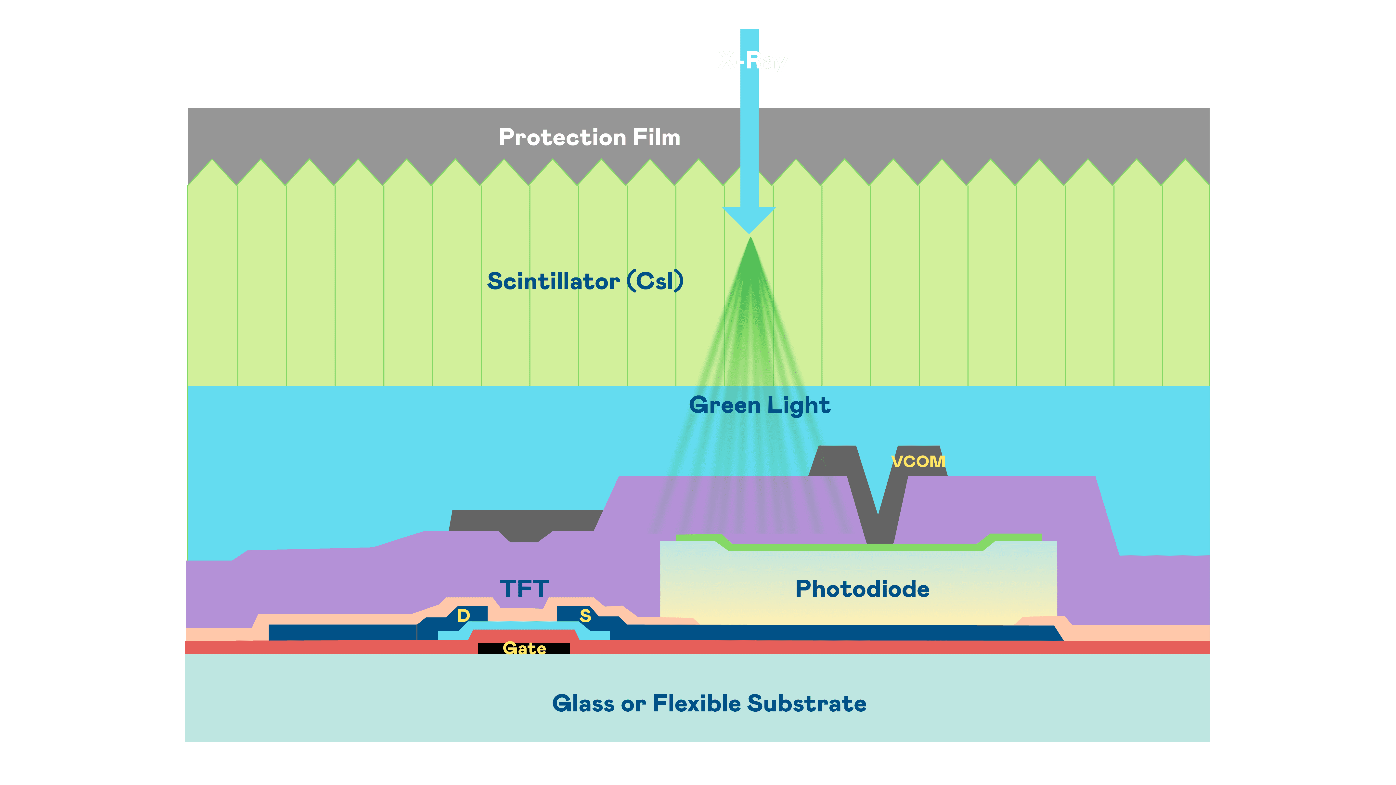 银河集团的X光影像感测阵列使用薄膜电晶体 (TFT) 作为每个像素的读取开关,,,,搭配光电二极体(Photodiode)的光电转换元件,,用以感测X光影像讯号。。